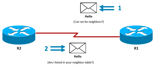 图 1. R1 发送初始 OSPF Hello 数据包。R2 使用 OSPF Reply Hello 数据包进行响应。
