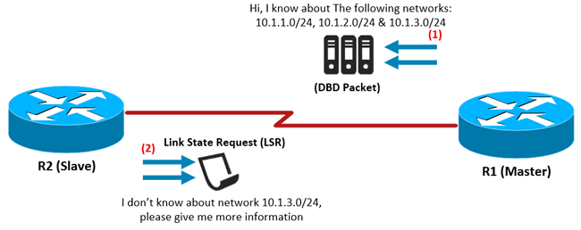 图2。步骤1 & 2:R1发送DBD数据包,R2回复LSR (Link State Request)