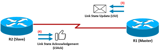 图3.步骤 3 和 4。R1 使用链路状态更新 (LSU) 进行回复,R2 使用 LSAck 进行确认