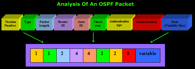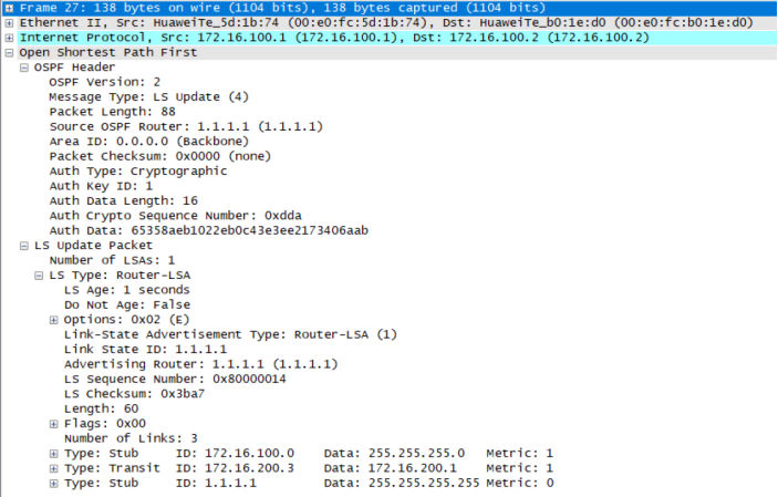 LSA包含在 LSU 内,而 LSU 都是封装在以太网帧内的OSPF 数据包的一部分(假设是以太网网络) **通过捕获下面的OSPF 以太网帧,**我们可以确认 LSU/LSA 数据包结构图。我们使用相同的颜色突出显示每个部分(LSA、LSU、OSPF Header):