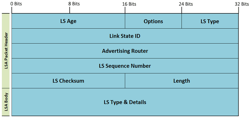 每个LSA数据包由一个报头和一个正文组成,其中包含在 OSPF 网络内交换网络信息所需的所有信息。下图显示了 OSPF LSA 数据包的结构:
