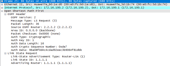 LSR报文用于请求相邻路由器链路状态数据库中的一部分数据。当两台路由器互相交换完DD报文后,知道对端路由器有哪些LSA是本LSDB所没有的,以及哪些LSA是已经失效的,则需要发送一个LSR报文,向对方请求所需的LSA。 LSR报文内容包括所需的LSA摘要,主要包含三个字段:Link State Type,Link State ID,Advertising Router;具体格式如下图所示:
