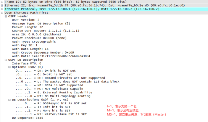 DD报文是用来描述本地路由器的链路状态数据库(LSDB),在两个OSPF路由器初始化连接时要交换DD报文,进行LSDB数据库同步。